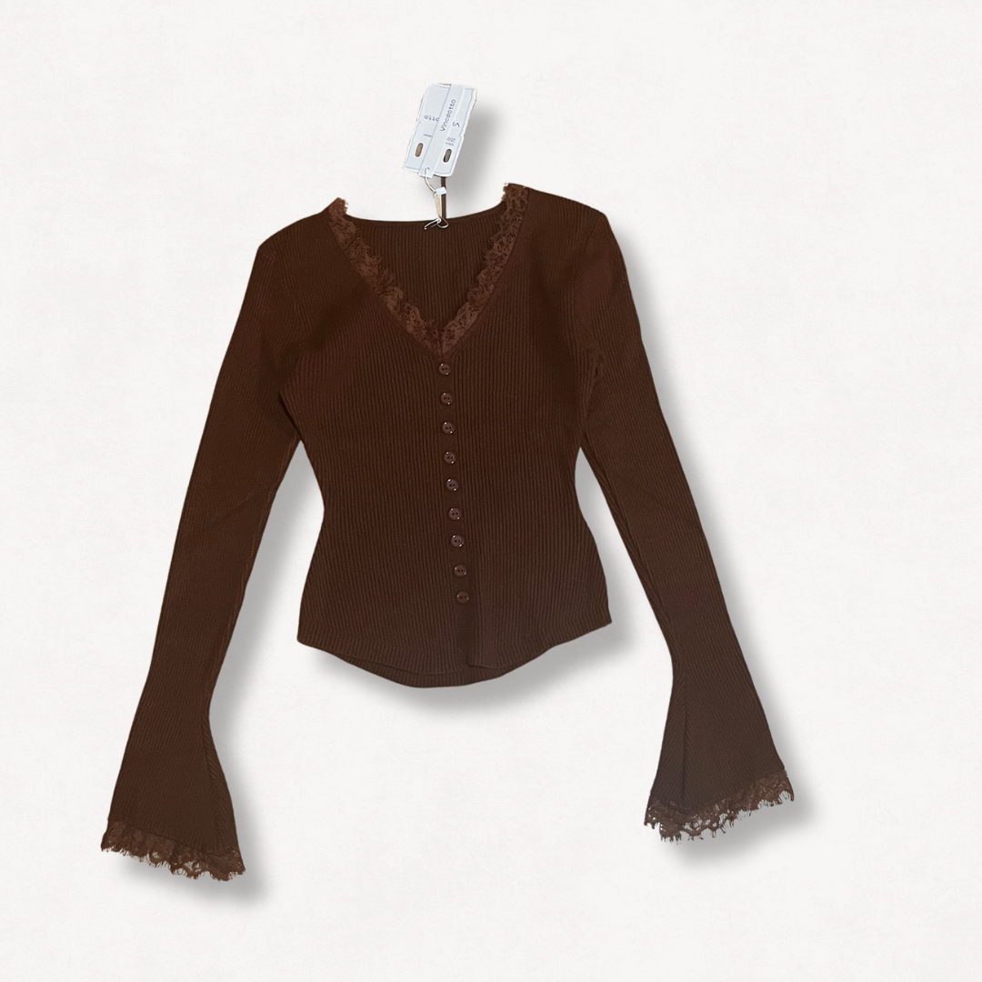 Camiseta estilo Cargias color marrón de punto acanalado con escote en pico y delicados detalles de encaje festoneado. Su silueta ajustada y los botones frontales aportan un aire femenino y elegante, mientras que el tejido suave realza la comodidad. Una prenda versátil y atemporal, perfecta para elevar cualquier look con un toque sutil y sofisticado.